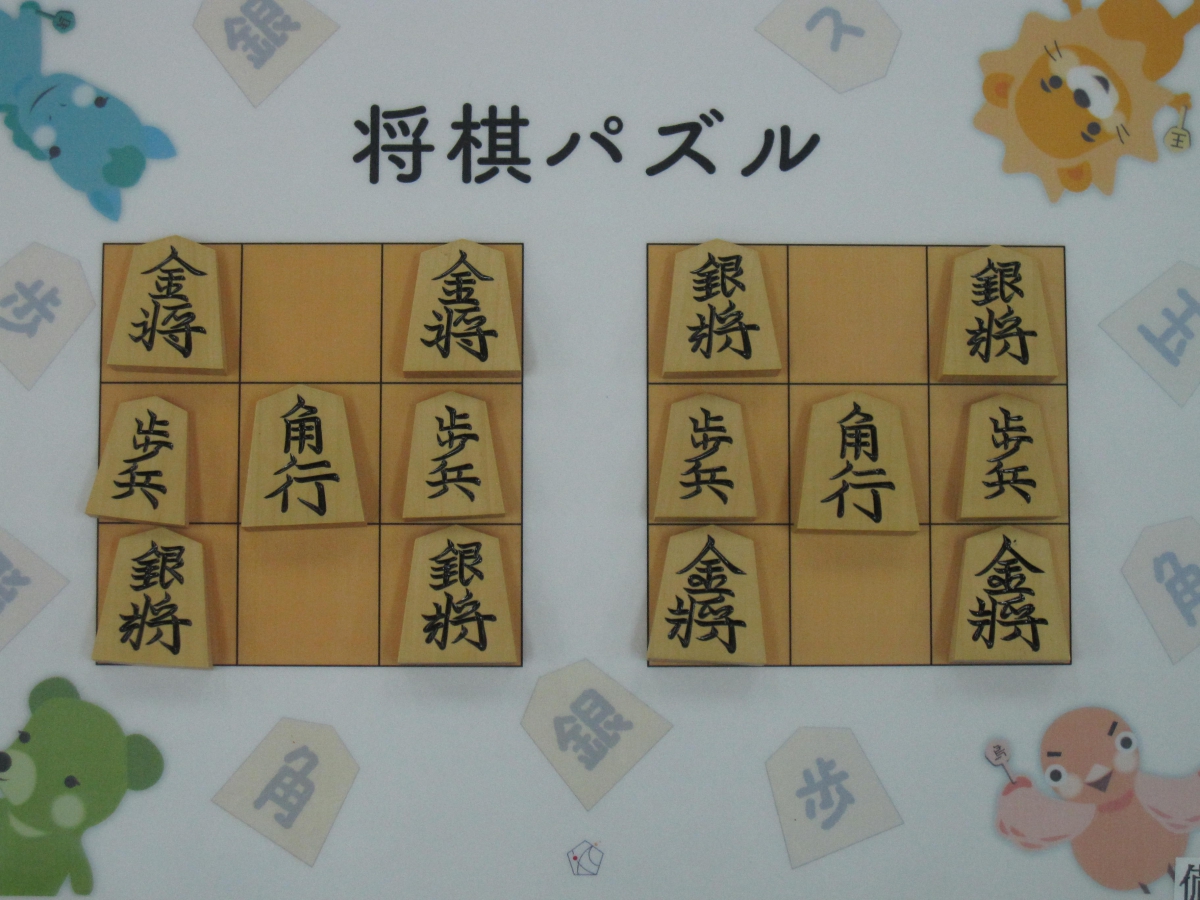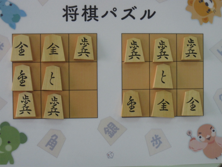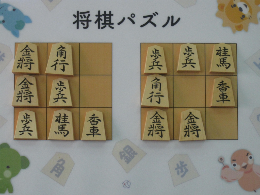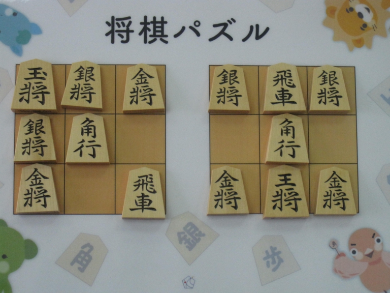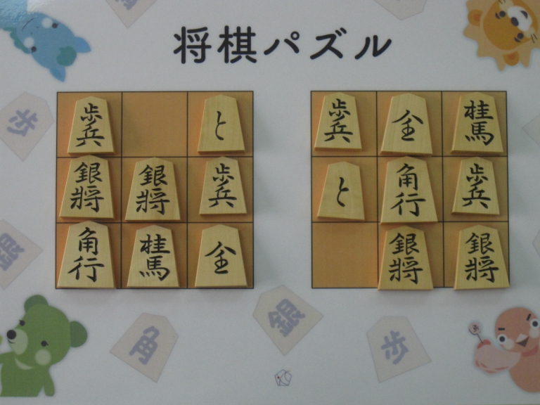 Let’s move the pieces in the left figure to be the positions in the right figure, following the piece movement rules. The pieces cannot move out the board of 3x3 squares. Shogi puzzle is an easy game with Shogi pieces and a board of 3x3 squares. Even young children without full knowledge of Shogi piece movements can enjoy Shogi puzzles.
