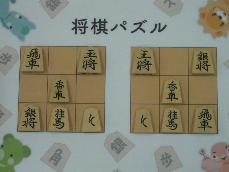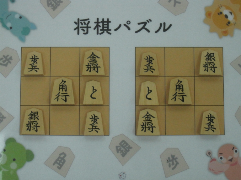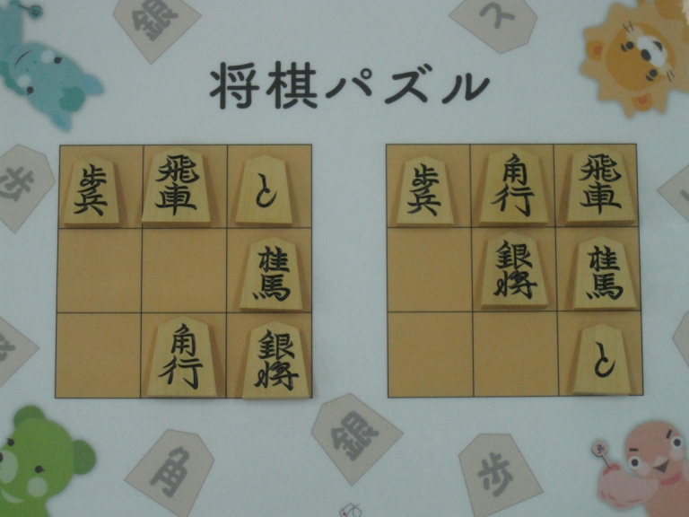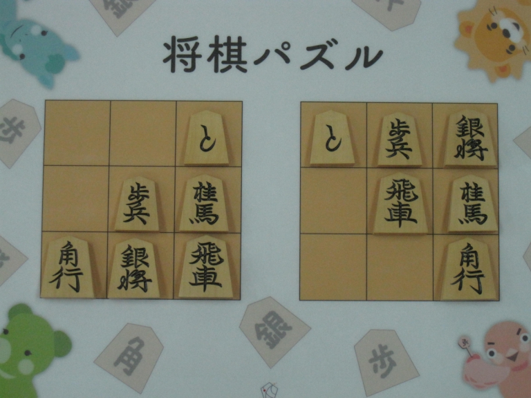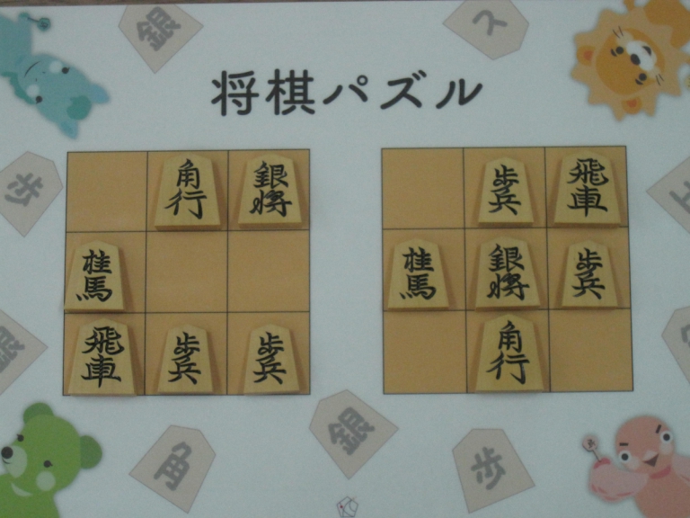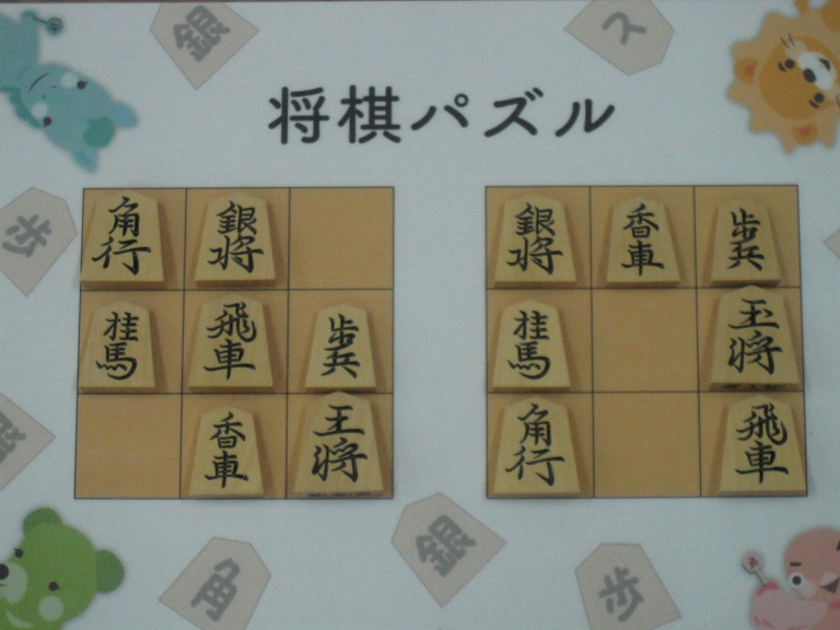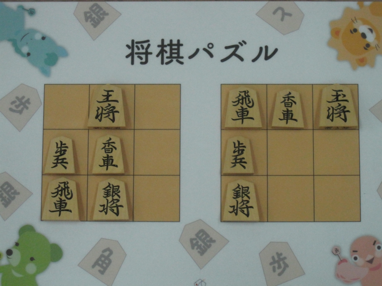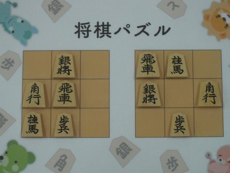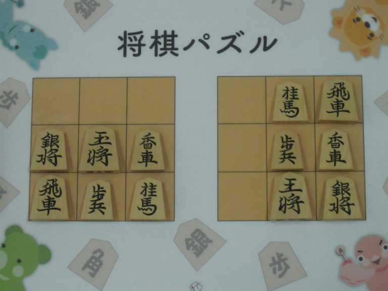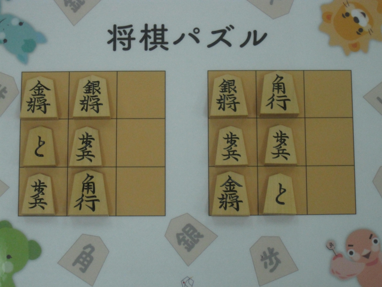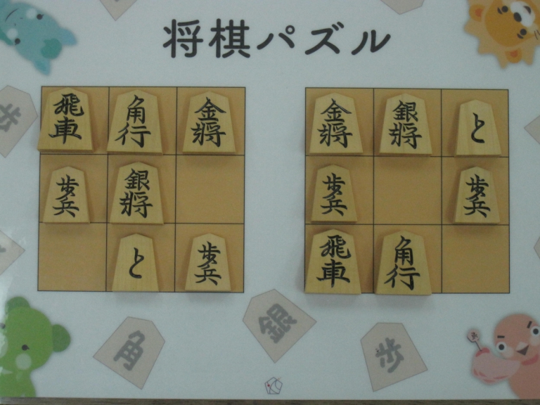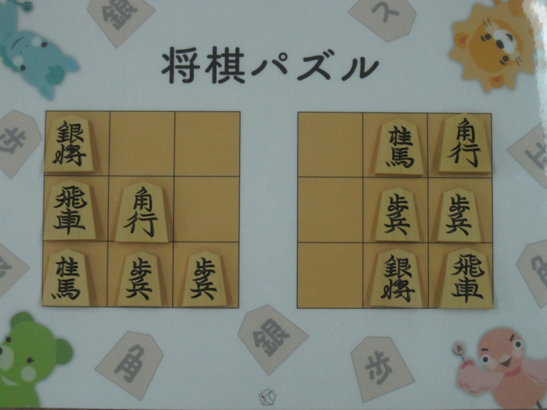 Let’s move the pieces in the left figure to be the positions in the right figure, following the piece movement rules. The pieces cannot move out the board of 3x3 squares. Shogi puzzle is an easy game with Shogi pieces and a board of 3x3 squares. Even young children without full knowledge of Shogi piece movements can enjoy Shogi puzzles.