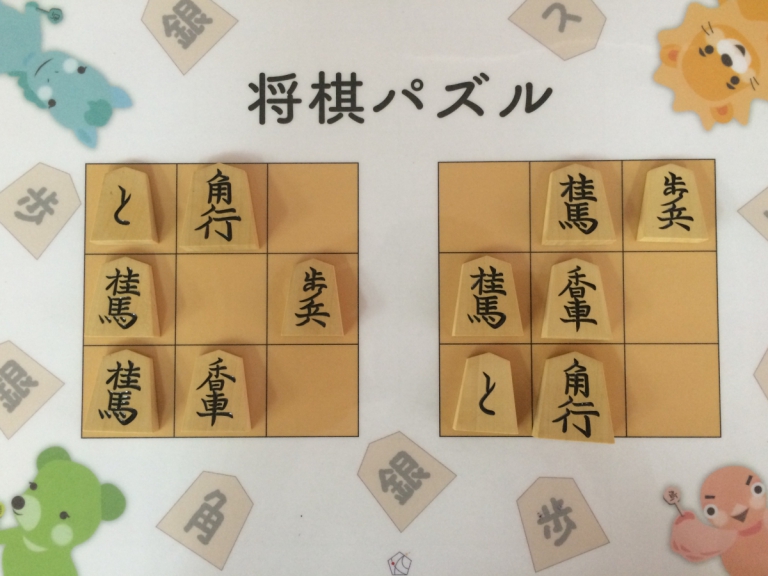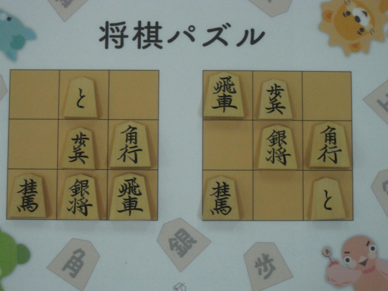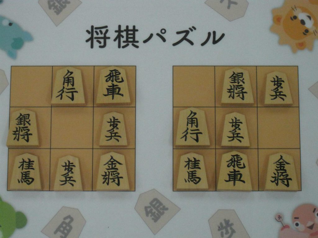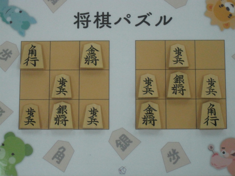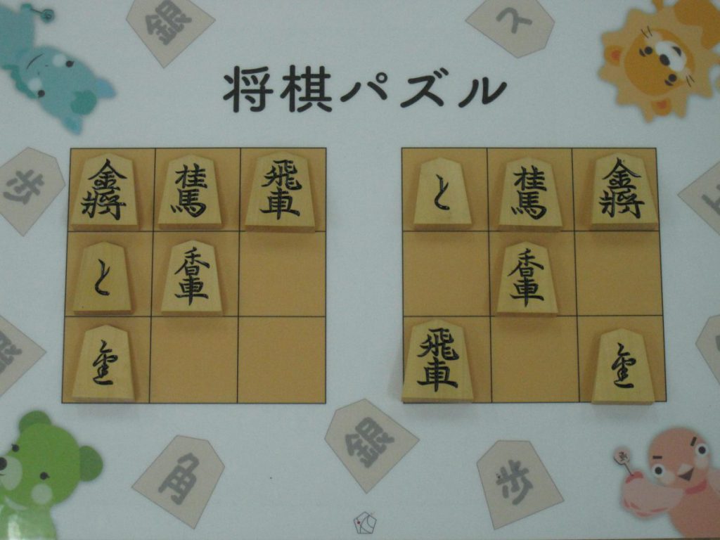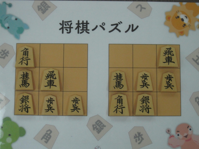 Let’s move the pieces in the left figure to be the positions in the right figure, following the piece movement rules. The pieces cannot move out the board of 3x3 squares. Shogi puzzle is an easy game with Shogi pieces and a board of 3x3 squares. Even young children without full knowledge of Shogi piece movements can enjoy Shogi puzzles.