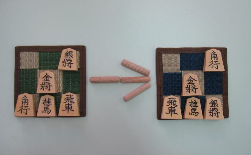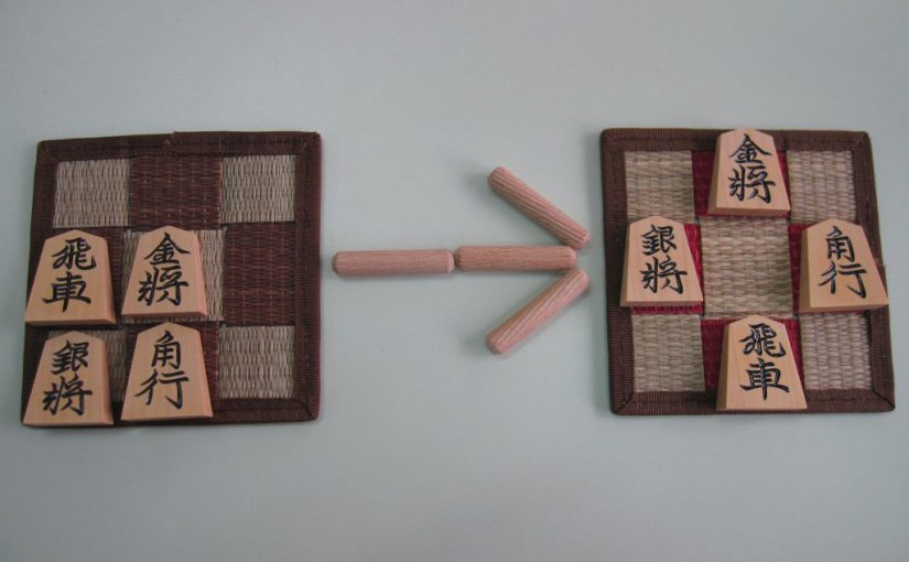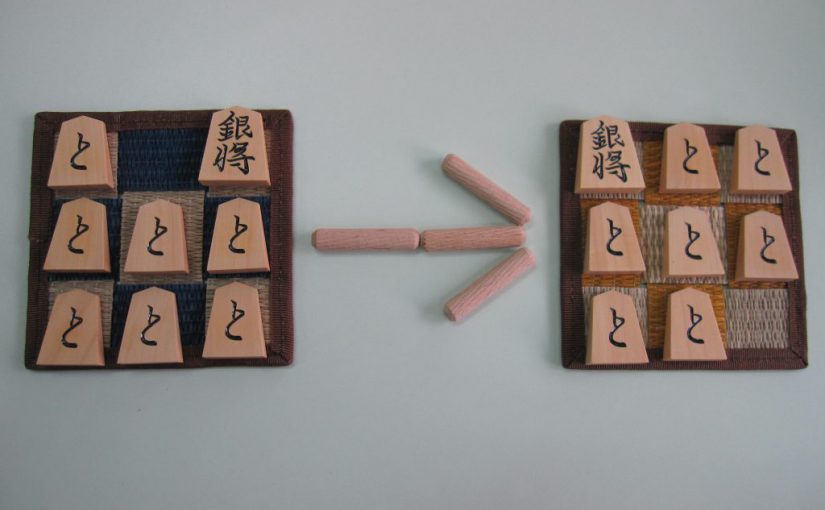 Let’s move the pieces in the left figure to be the positions in the right figure, following the piece movement rules. The pieces cannot move out the board of 3x3 squares. Shogi puzzle is an easy game with Shogi pieces and a board of 3x3 squares. Even young children without full knowledge of Shogi piece movements can enjoy Shogi puzzles.