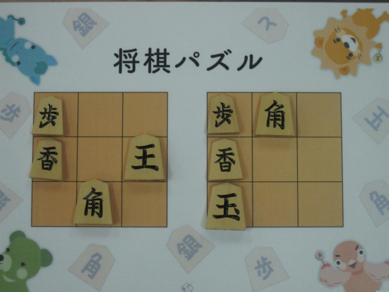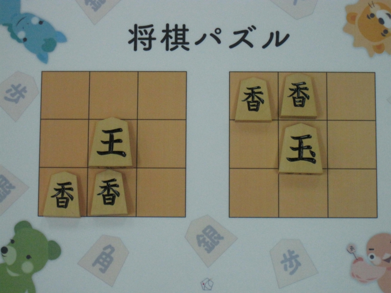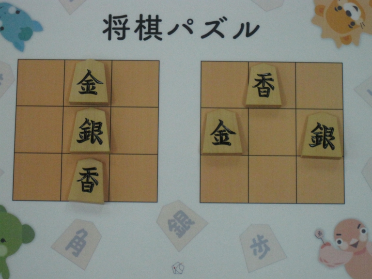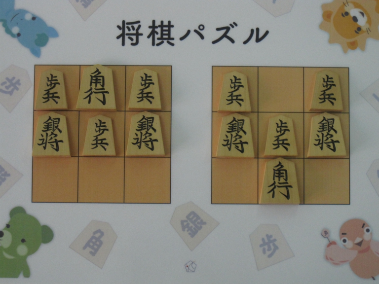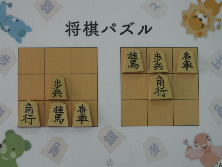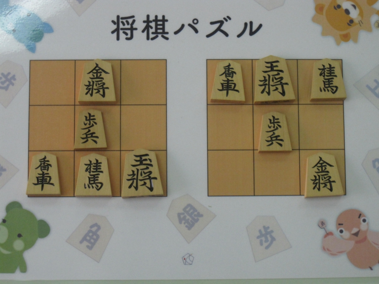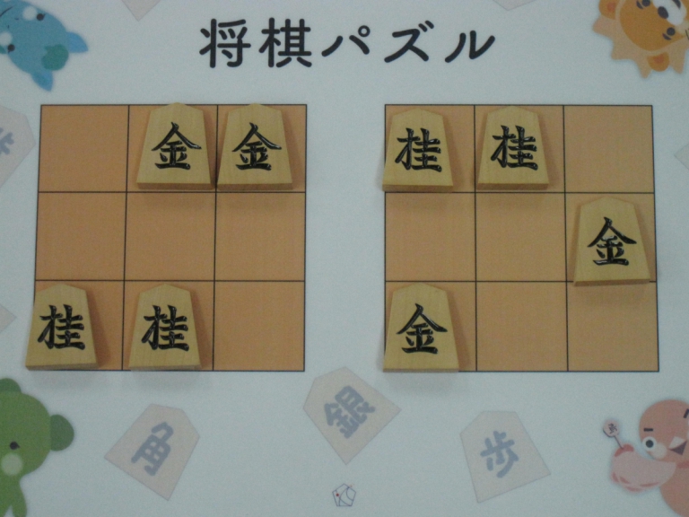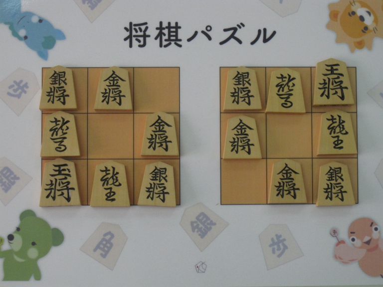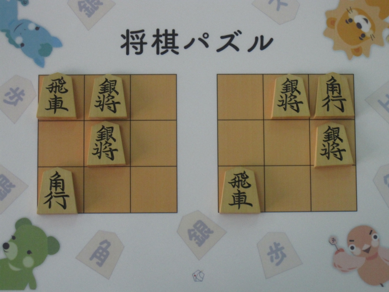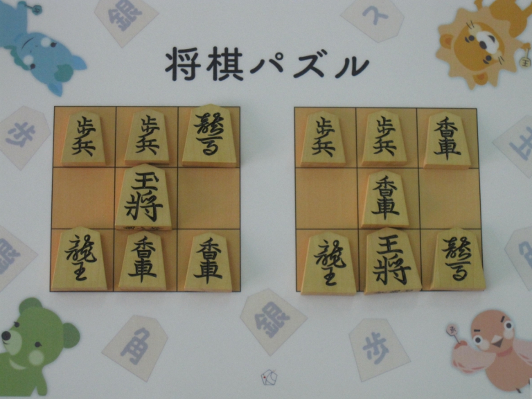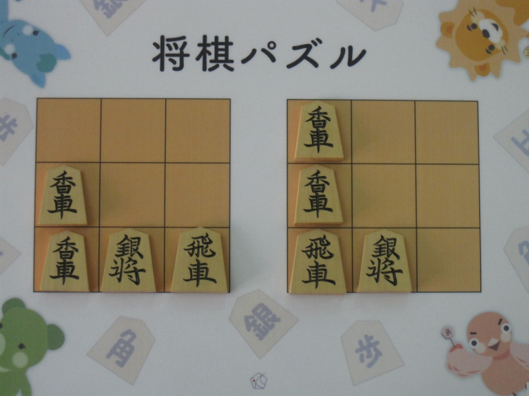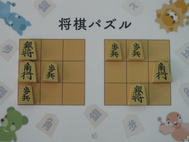 Let’s move the pieces in the left figure to be the positions in the right figure, following the piece movement rules. The pieces cannot move out the board of 3x3 squares. Shogi puzzle is an easy game with Shogi pieces and a board of 3x3 squares. Even young children without full knowledge of Shogi piece movements can enjoy Shogi puzzles.