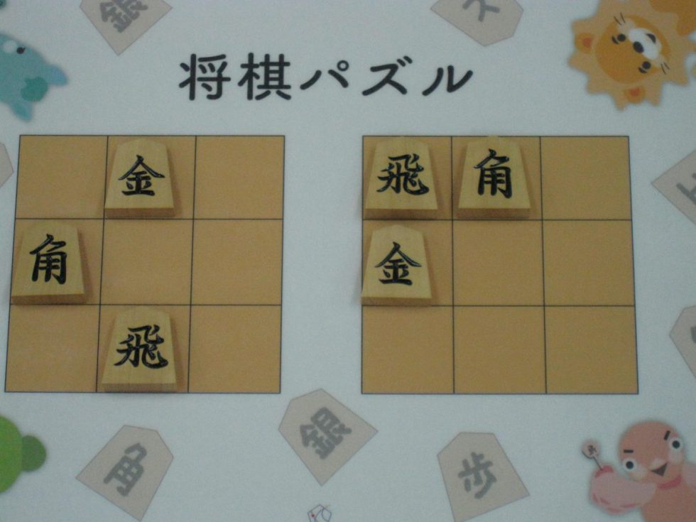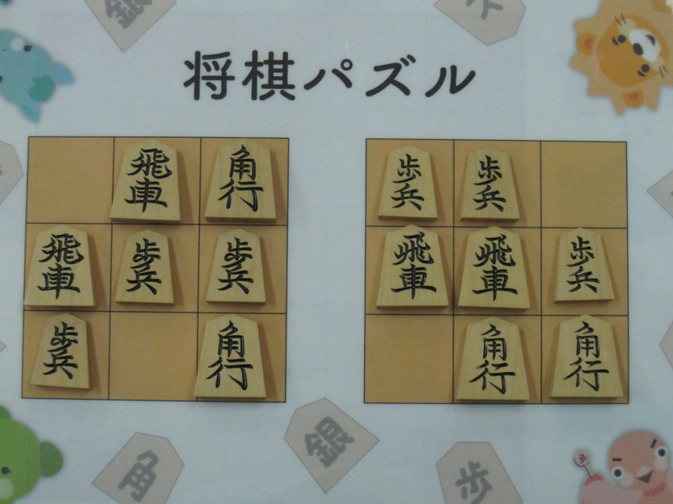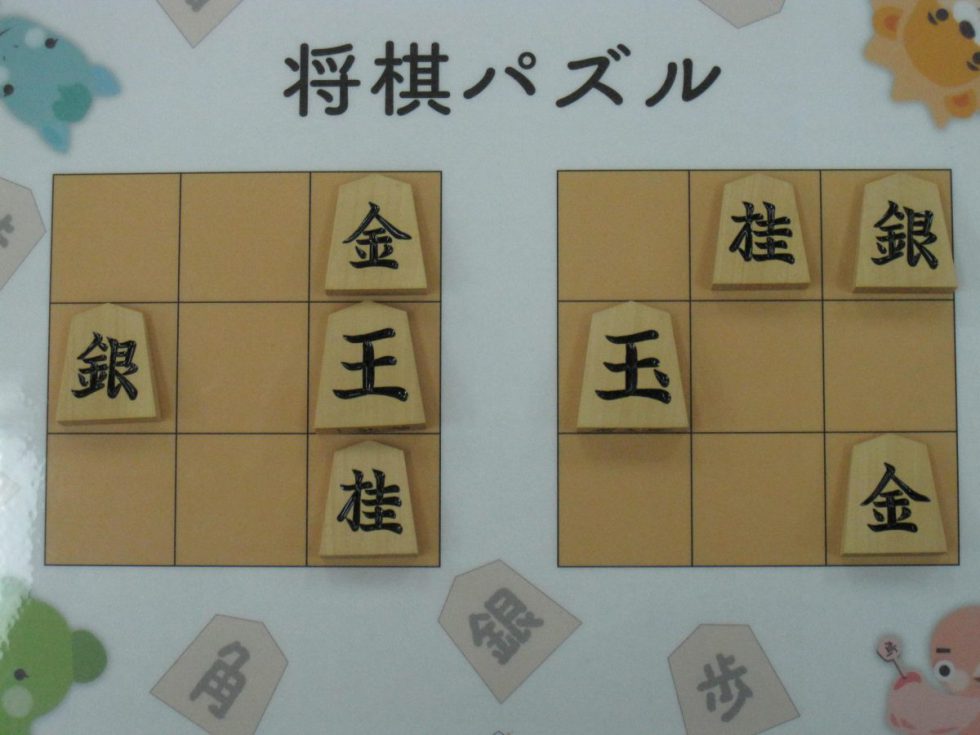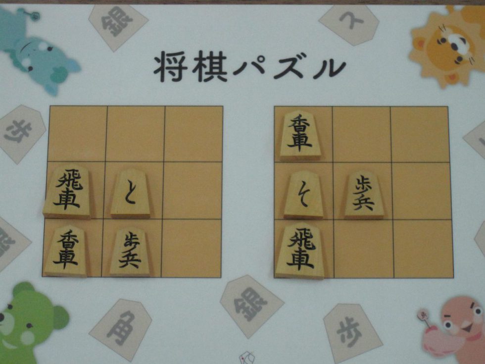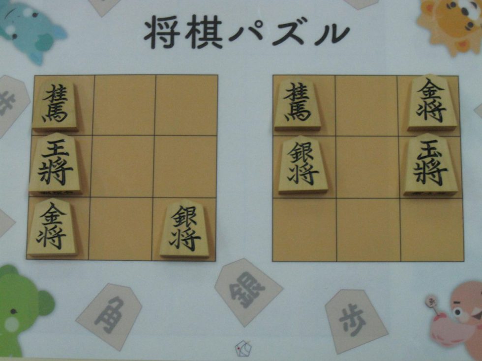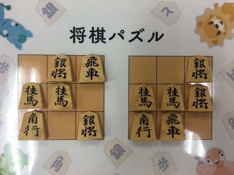Let’s move the pieces in the left figure to be the positions in the right figure, following the piece movement rules. The pieces cannot move out the board of 3x3 squares. Shogi puzzle is an easy game with Shogi pieces and a board of 3x3 squares. Even young children without full knowledge of Shogi piece movements can enjoy Shogi puzzles.