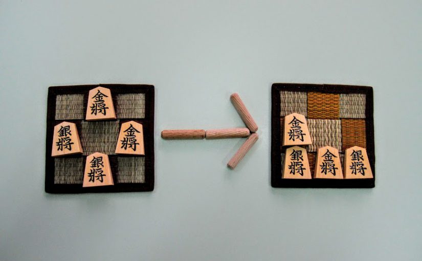 Let’s move the pieces in the left figure to be the positions in the right figure, following the piece movement rules. The pieces cannot move out the board of 3x3 squares. Shogi puzzle is an easy game with Shogi pieces and a board of 3x3 squares. Even young children without full knowledge of Shogi piece movements can enjoy Shogi puzzles.